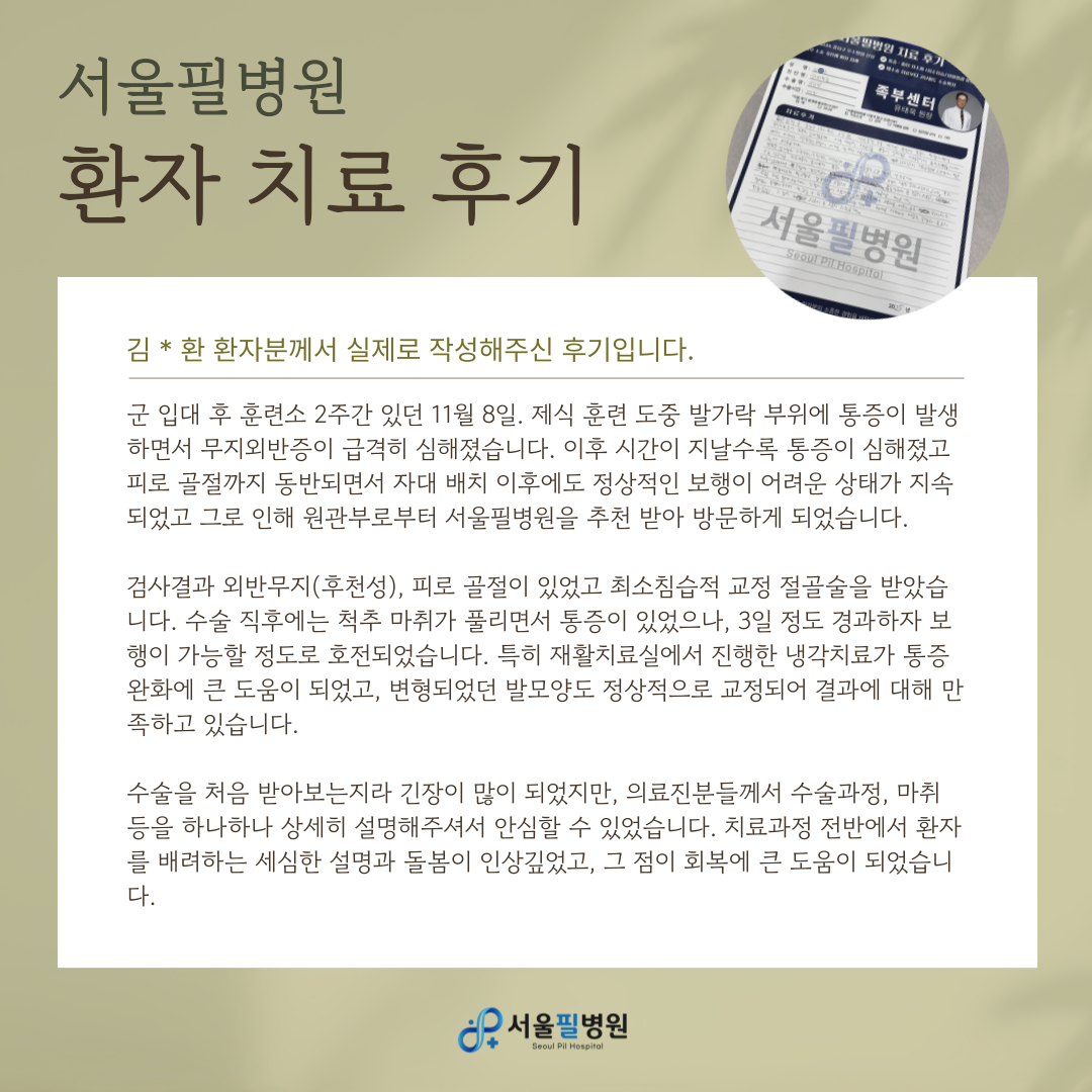 군 입대 후 훈련소 2주간 있던 11월 8일. 제식 훈련 도중 발가락 부위에 통증이 발생하면서 무지외반증이 급격히 심해졌습니다. 이후 시간이 지날수록 통증이 심해졌고 피로 골절까지 동반되면서 자대 배치 이후에도 정상적인 보행이 어려운 상태가 지속되었고 그로 인해 원관부로부터 서울필병원을 추천 받아 방문하게 되었습니다.