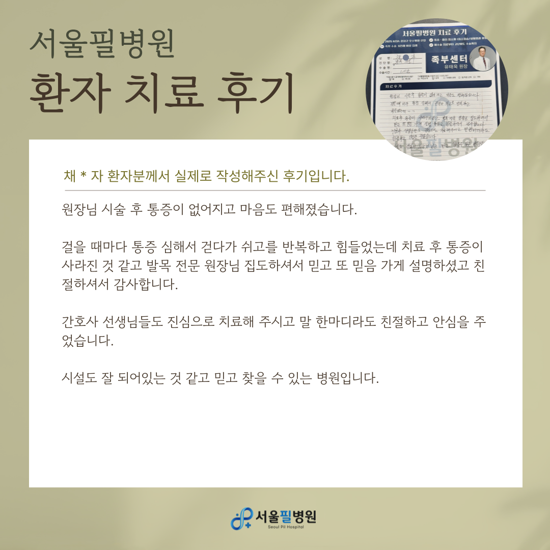 원장님 시술 후 통증이 없어지고 마음도 편해졌습니다. 걸을 때마다 통증 심해서 걷다가 쉬고를 반복하고 힘들었는데 치료 후 통증이 사라진 것 같고 발목 전문 원장님 집도하셔서 믿고 또 믿음 가게 설명하셨고 친절하셔서 감사합니다. 간호사 선생님들도 진심으로 치료해 주시고 말 한마디라도 친절하고 안심을 주었습니다. 시설도 잘 되어있는 것 같고 믿고 찾을 수 있는 병원입니다. |