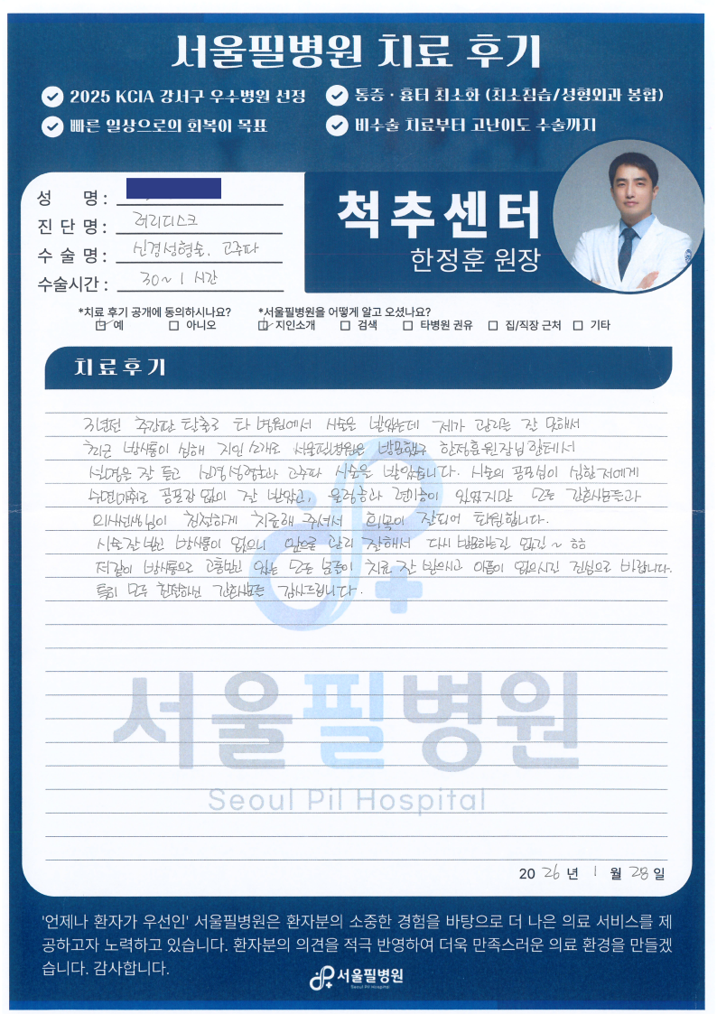 3년 전 추간판 탈출로 타 병원에서 시술을 받았는데 제가 관리를 잘 못해서 최근 방사통이 심해 지인 소개로 서울필병원을 방문했고 한정훈 원장님한테서 설명을 잘 듣고 신경성형술과 고주파 시술을 받았습니다.
