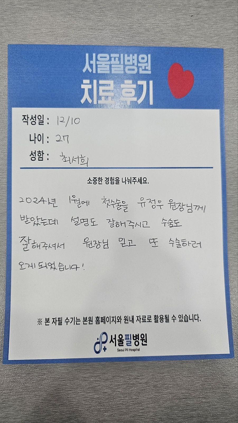 유정우 원장님께 수술을 받았는데 설명도 잘해주시고 수술도 잘해주십니다.