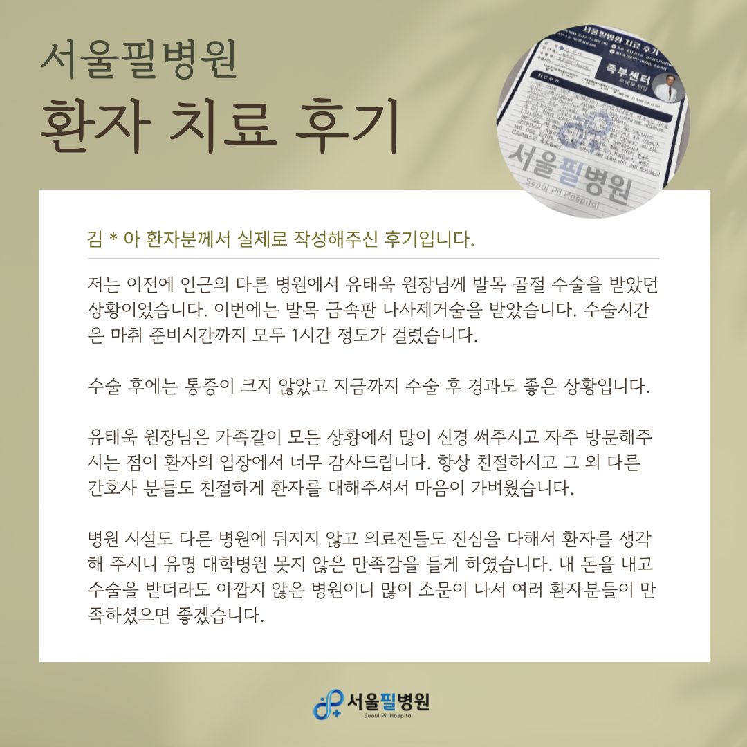 저는 이전에 인근의 다른 병원에서 유태욱 원장님께 발목 골절 수술을 받았던 상황이었습니다. 이번에는 발목 금속판 나사제거술을 받았습니다. 수술시간은 마취 준비시간까지 모두 1시간 정도가 걸렸습니다.