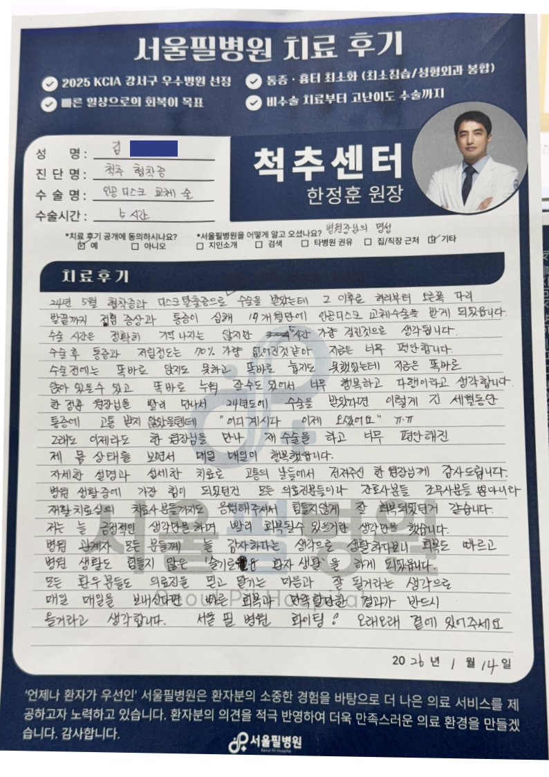수술 후 통증과 저림 정도는 70%가량 없어진 것 같아 지금은 너무 편안합니다. 수술 전에는 똑바로 앉지도 못하고 똑바로 눕지도 못했었는데 지금은 똑바로 앉아 있을 수 있고 똑바로 누워 잘 수도 있어서 너무 행복하고 다행이라고 생각합니다. 한정훈 원장님을 빨리 만나서 24년도에 수술을 받았다면 이렇게 긴 세월 동안 통증에 고통받지 않았을 텐데 “어디 계시다 이제 오셨어요” ㅠ.ㅠ