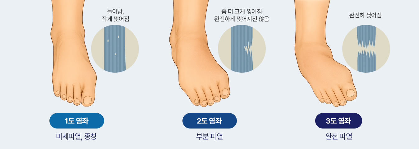 발목을 접질리거나 사고 또는 외상에 의해 인대가 손상 혹은 파열 되는 증상입니다. 심한 경우 만성적인 불안정성이나